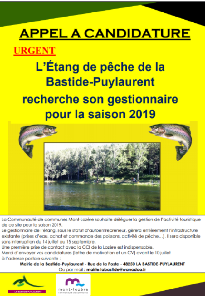 La Communauté de communes Mont-Lozère souhaite déléguer la gestion de l’activité touristique de ce site pour la saison 2019. Le gestionnaire de l’étang, sous le statut d’autoentrepreneur, gérera entièrement l’infrastructure existante (prises d’eau, achat et commande des poissons, activité de pêche…). Il sera disponible sans interruption du 14 juillet au 15 septembre. Une première prise de contact avec la CCI de la Lozère est indispensable. Merci d’envoyer vos candidatures (lettre de motivation et un CV) avant le 10 juillet à l’adresse postale suivante : Mairie de la Bastide-Puylaurent – Rue de la Poste – 48250 LA BASTIDE-PUYLAURENT Ou par mail : mairie.labastide@wanadoo.fr